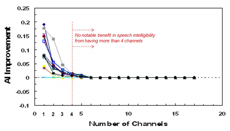 They found that the perceived benefit in speech audibility beyond 4 channels is marginal, or “statistically insignificant”. The most drastic improvement occurs when moving from 1 to 2 channel devices.